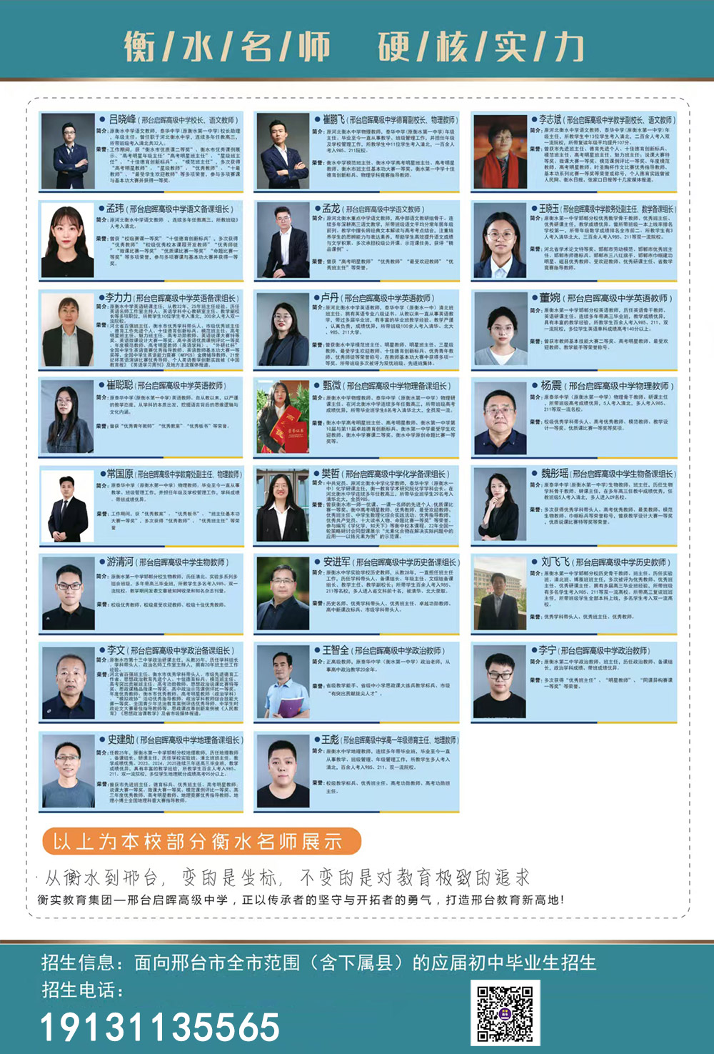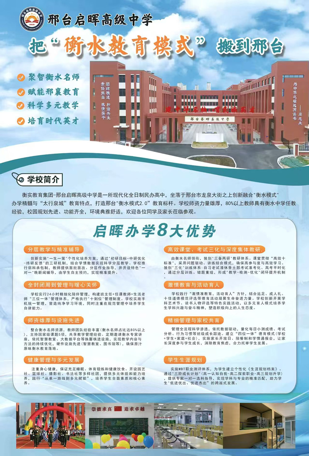 衡实教育集团邢台启晖高中,80%的师资有衡水任教经验,与衡实同师资同教研同教案,把原汁原味的衡中教育教学模式全面移植到邢台,是我们家门口的衡中,让孩子们不出邢台,就能享受到衡中优质的教育教学资源。王炸的师资天团、先进的衡中教育教学理念,必能助力孩子圆梦名校,逐光前行,抵达理想彼岸!班型设置分三种:衡中班(100%衡水优秀师资)、清北班(80%衡水优秀师资)、实验班(50%以上衡水优秀师资)。其中衡中班人数为30—40人的小班。