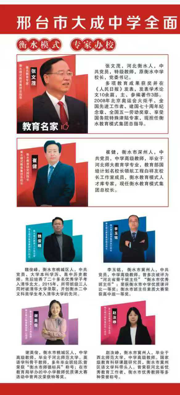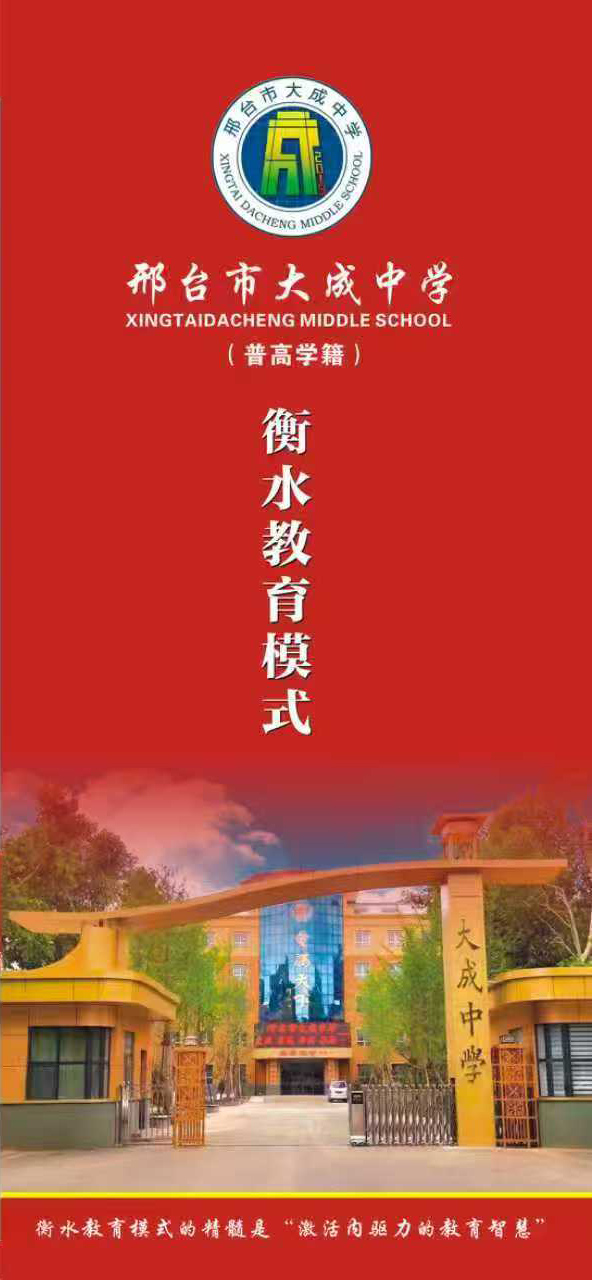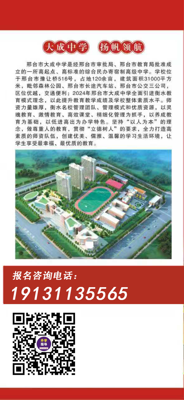 邢台市大成中学是经邢台市审批局、邢台市教育局批准成立的一所高起点、高标准的综合民办寄宿制高级中学。学校位于邢台市豫让桥516号,占地120余亩,建筑面积31000平方米,毗邻森林公园、邢台市长途汽车站、邢台市公交三公司,区位优越,交通便利;2024年邢台市大成中学全面引进衡水模式教育理念,以此提升教育教学成绩及学校整体素质水平。师资力量雄厚,衡水名校管理团队、管理模式和优质资源,以灵魂教育、激情教育、高效课堂、精细化管理为抓手,以养成教育为基础,以低进高出为办学特色。坚持“以人为本”的理念,做尊重人的教育,贯彻“立德树人”的要求,全力打造高素质的师资队伍,创建优美、儒雅、温馨的学习生活环境,让学生享受最幸福、最优质的教育。